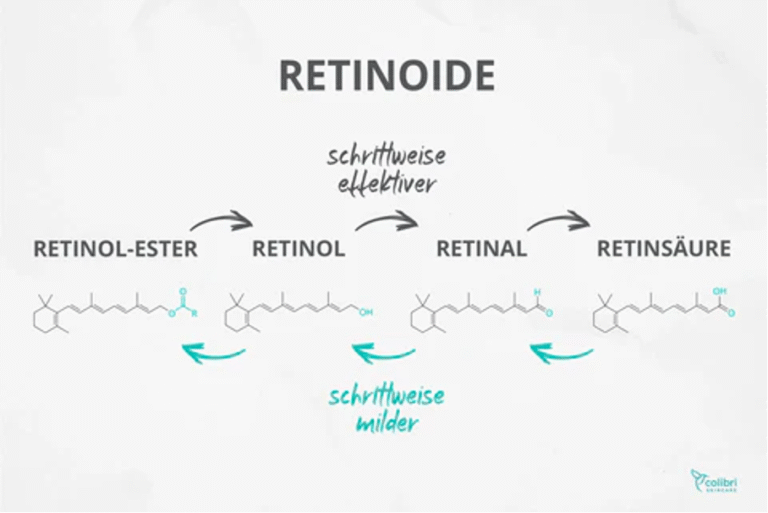 Retinol gehört zur großen Familie der Retinoide – allesamt Verwandte von Vitamin A. Damit es in der Haut aktiv werden kann, durchläuft es eine Umwandlung: